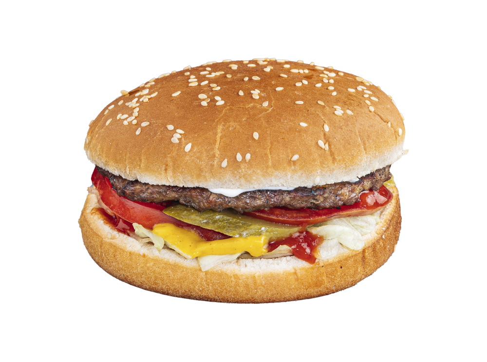 Булочка, Тузланган бодринг, Помидор, Мол гўштли котлет, Майонез